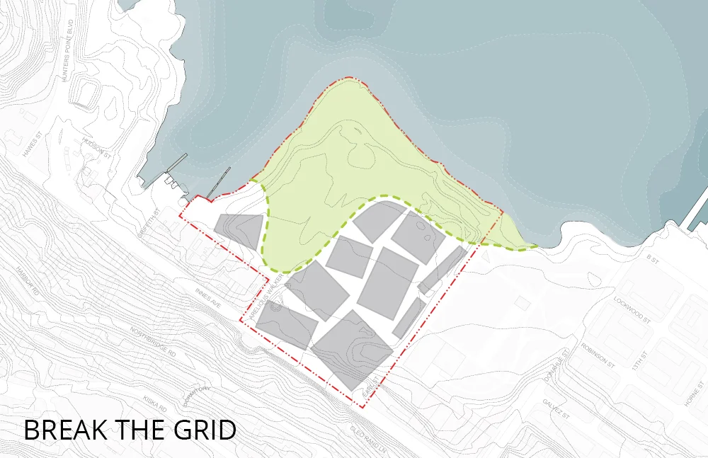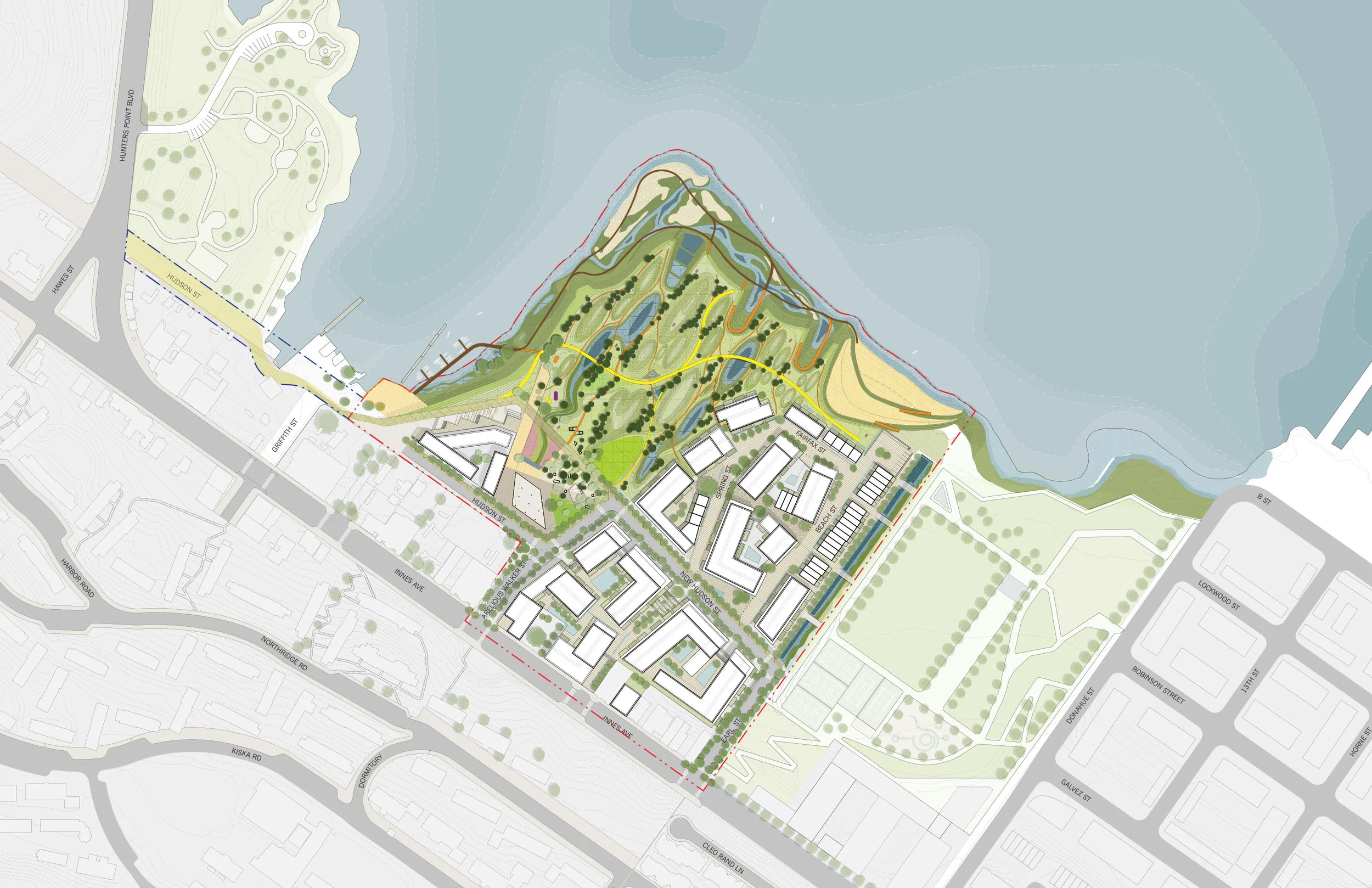 The India Basin Project is a 900+ unit residential masterplan in the India Basin neighborhood of San Francisco. Sited on one of the last wild, undeveloped sites in the bay, the project aims to celebrate and enhance the feral character of the site by maximizing open space and connections to the waterfront. The massing and positioning of the public realm is heavily driven by geotechnical constraints and hydrological needs. A system of bioswales, retention ponds, and street runnels allows the project to capture treat, and use 100% of the stormwater and natural springwater on site.